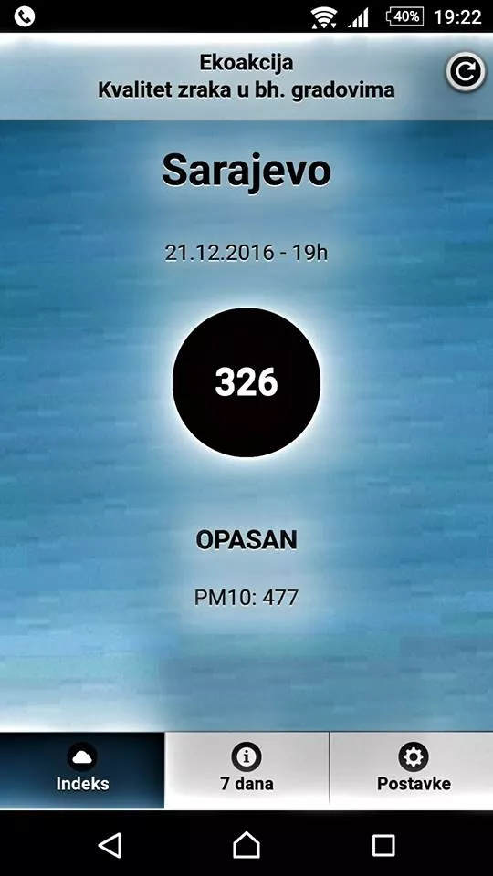 Večeras u 19 sati u Sarajevu je zabilježeno enormno zagađenjenje zraka, a kvaliteta na novoj mobilnoj aplikaciji Udruženja Eko akcija, definisana je kao “opasna”, piše Patria.