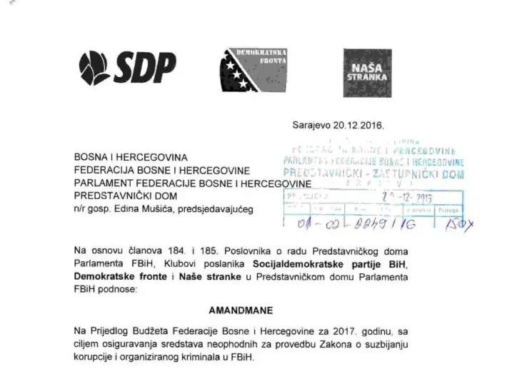 Klubovi poslanika SDP BiH, DF-a, Naše stranke u Predstavničkom domu Parlamenta FBiH uputili su amandmane na prijedlog Budžeta FBIH za 2017. godinu neophodnih za provedbu Zakona o subijanju korupcije i organiziranog kriminala u FBiH.