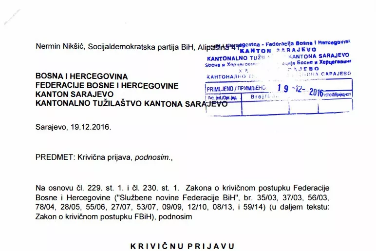 osoba, koja je podnijeta Kantonalnom tužilaštvu Kantona Sarajevo dana 19.12.2016. godine, zbog postojanja sumnje da su učinili krivična djela lažno prijavljivanje iz člana 347. i zloupotreba položaja ili ovlaštenja iz člana 383. Krivičnog zakona Federacije BiH ("Službene novine Federacije BiH", br. 36/03, 37/03, 21/04, 69/04, 18/05, 42/10, 42/11, 59/14, 76/14, i 46/16).