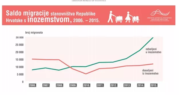 Index.hr piše da je prošle godine iz Hrvatske u inozemstvo odselilo nešto manje od 30 hiljada osoba, dok se u Hrvatsku doselilo tek nešto više od 11 hiljada osoba te je saldo migracije s inozemstvom bio negativan i iznosio je -17 945. Migracijski saldo posljednji je put bio pozitivan 2008., kada je iznosio 7.053, a tek godinu poslije iznosio je -1 472. Najveći skok u migracijskom saldu među pojedinačnim godinama zabilježen je u 2014., kada se razlika između broja doseljenih i odseljenih više nego udvostručila u odnosu na godinu prije.