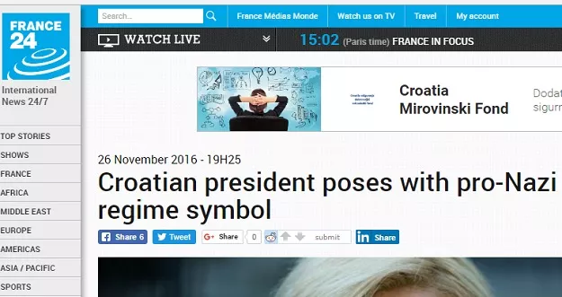 France 24, francuska televizija na engleskom jeziku na svojim je stranicama objavila članak o tome kako se predsjednica Hrvatske Kolinda Grabar Kitarović u Kanadi slikala s ustaškom zastavom. Oni zapravo prenose članak jedne od najpoznatijih svjetski agencija, agencije AFP kojoj također nije promakla fotografija hrvatske predsjednice koja se slikala sa zastavom s prvim bijelim poljem,prenosi Patria.