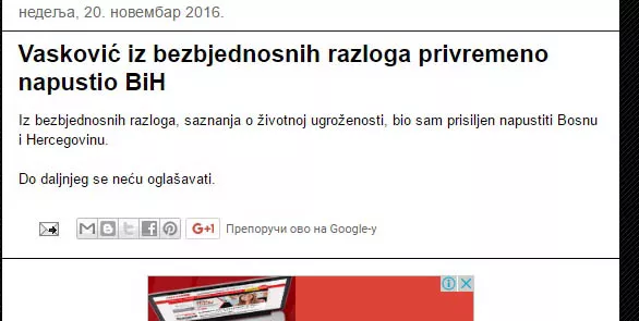 Iz bezbjednosnih razloga, saznanja o životnoj ugroženosti, bio sam prisiljen napustiti Bosnu i Hercegovinu. Do daljnjeg se neću oglašavati - napisao je na svom blogu novinar Slobodan Vasković.