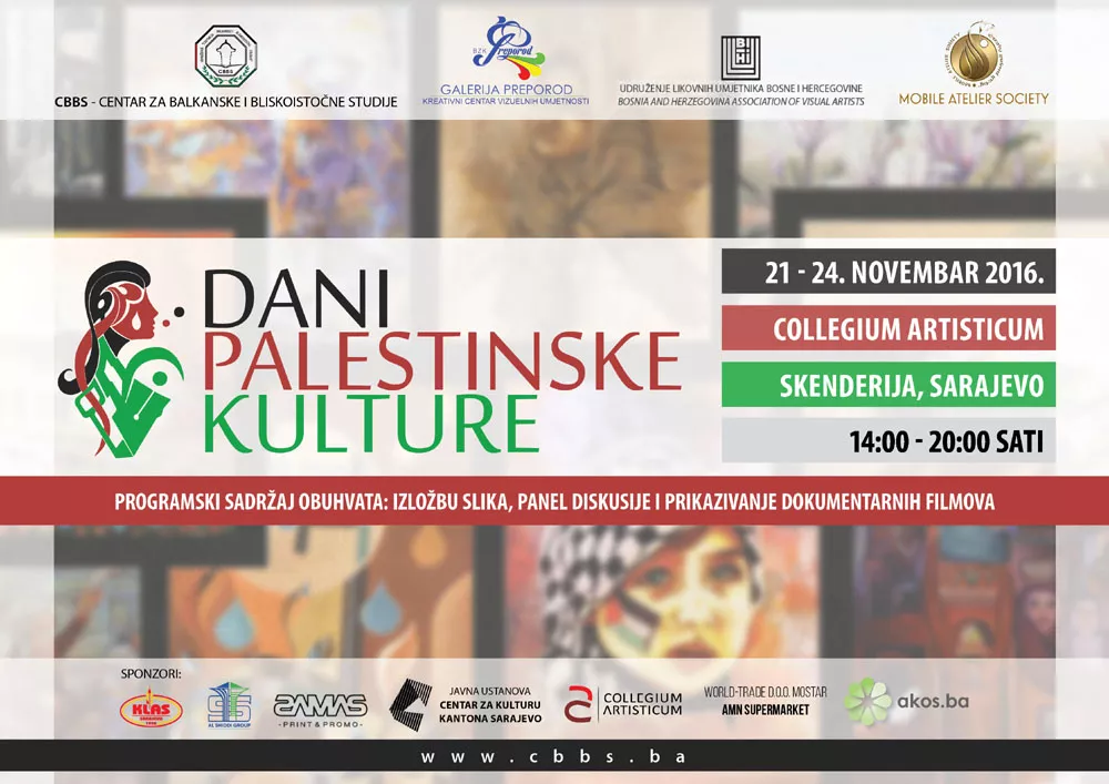 Centar za balkanske i bliskoistočne studije sa partnerima organizira manifestaciju „Dani palestinske kulture“ u BiH koja će se održati od 21. do 24. novembra 2016. godine. Otvaranje manifestacije održat će se u Collegium Artisticum u Centru Skenderija 21. novembra u 17 sati, piše bh. novinska agencija Patria.