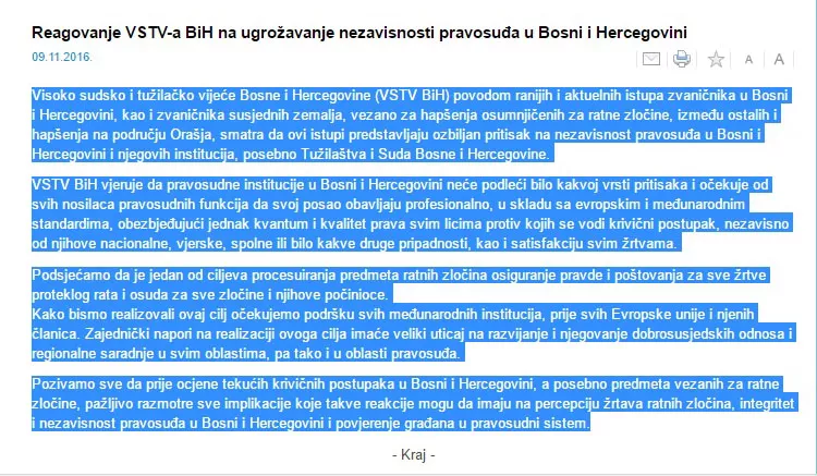 Pozivamo sve da prije ocjene tekućih krivičnih postupaka u Bosni i Hercegovini, a posebno predmeta vezanih za ratne zločine, pažljivo razmotre sve implikacije koje takve reakcije mogu da imaju na percepciju žrtava ratnih zločina, integritet i nezavisnost pravosuđa u Bosni i Hercegovini i povjerenje građana u pravosudni sistem.