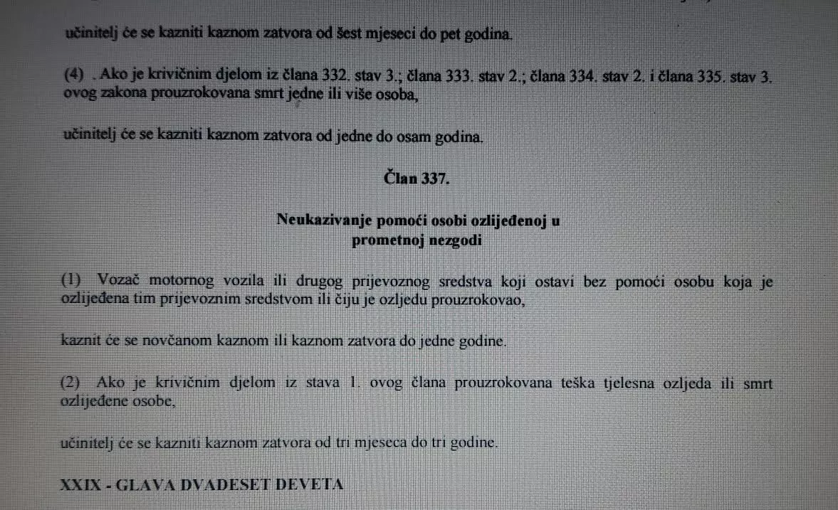 Krivični zakon Federacije BiH u Članu 337 stav 2 kaže da vozač motornog vozila ili drugog prijevoznog sredstva koji ostavi bez pomoći osobu koja je teško ozlijeđena tim prijevoznim sredstvom ili čiju je ozljedu prouzrokovao, ili ako je nastupila smrt, kaznit će se zatvorskom kaznom od tri mjeseca do tri godine, piše Patria.