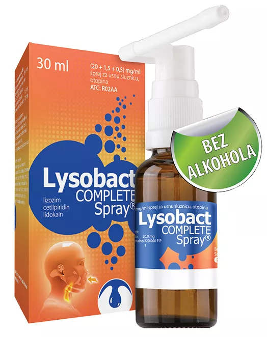 Jedinstveni sastav lijeka Lysobact COMPLETE Spray® za usnu sluznicu baziran je na lizozimu, prirodnoj supstanci našeg organizma i važnom faktoru lokalne otpornosti sluznice. Aktivne komponente lijeka Lysobact COMPLETE Spray®: smiruju upalni proces, pomažu zarastanje rana i oštećenja sluznice usne šupljine, ubrzavaju ozdravljenje, štite sluznicu usne šupljine i grla te pojačavaju lokalni imuni odgovor sluznice. Lidokain ublažava osjet bola veoma brzo, već u toku prvih nekoliko minuta nakon primjene.