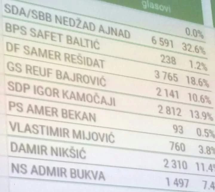 SDP-ova kandidat Igor Kamočaji osvojio je 2.812, nezavisni kandidat Damir Nikšić 2.310, kandidat GS Reuf Bajrović 2.141 glas, NS Admir Bukva 1.479, nezavisni kandidat Vlastimir Mijović 760, BPS Safet Baltić 238 te kandidat Prve strane Amer Bekan 93 glasa.