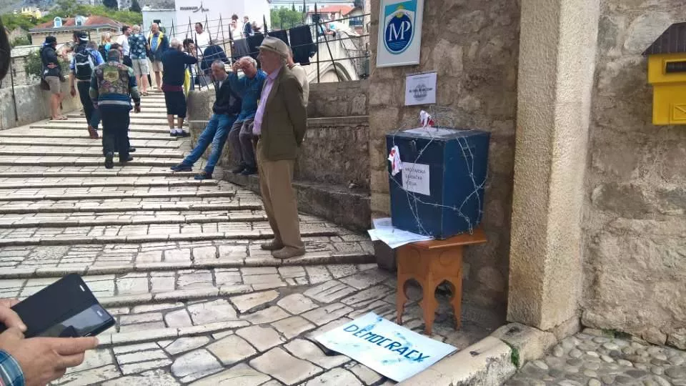 Na Starom mostu u Mostaru danas je Prva mostarska partija postavila instalaciju Mostarska glasačka kutija.