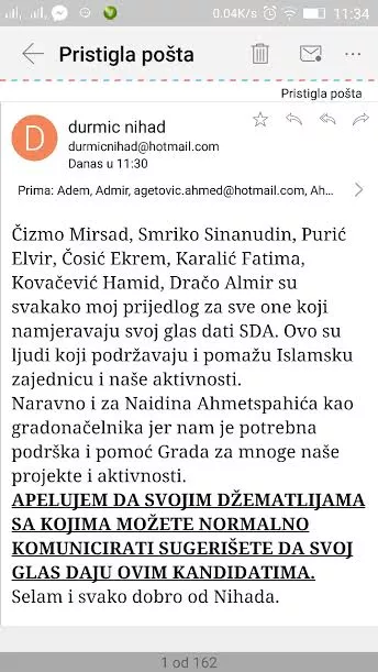 -Ovaj službenik uzeo je sebi za pravo da poziva svoje kolege iz MIZ Zenica i, kako navodi, džematlije, da glasaju za kandidate SDA. Ovom prilikom molim uvažene, muftiju zeničkog dr. Ejuba ef. Dautovića i glavnog imama Jakuba ef. Salkicu da se izjasne po pitanju poziva kojeg vjerskim službenicima i džematlijama šalje gore pomenuti Nihad Durmić.