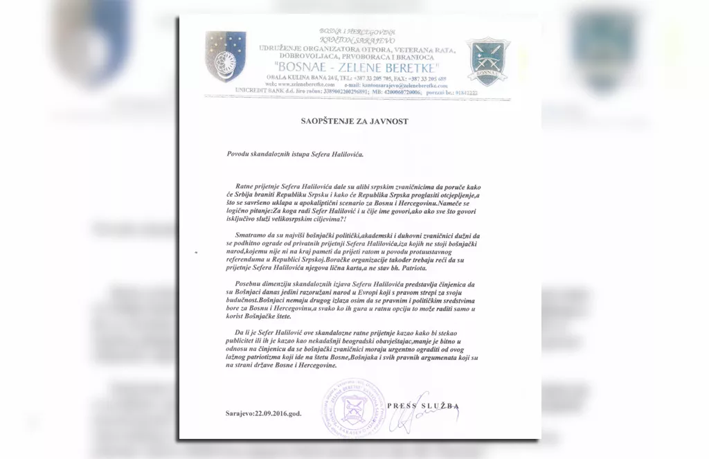 Iz Udruženja Bosna-Zelene beretke oštro su kritikovali izjave penzionisanog generala Armije R BiH Sefera Halilovića, koji je u emisiji na TV1 poručio da će Republika Srpska nestati, ukoliko dođe do raspakivanja Dejtonskog mirovnog sporazuma i novog sukoba. Halilović je zaprijetio novim ratom, piše novinska agencija Patria.