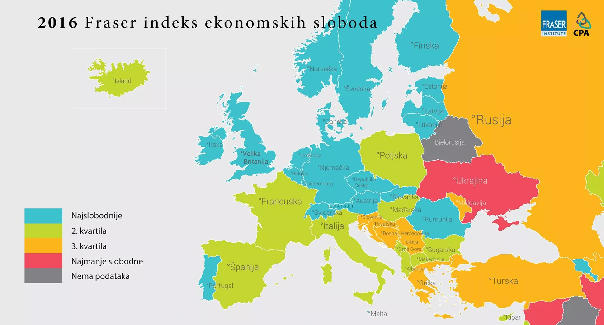 BiH se nalazi na 91. poziciji od ukupno 158 država i Hong Konga koje su obuhvaćene u izvještaju Ekonomske slobode širom svijeta: 2016 - Godišnji izvještaj, koji je objavljen danas od strane Centra za poslovnu afirmaciju (CPA) u saradnji sa Fraser Institutom iz Kanade, prenosi novinska agencija Patria.