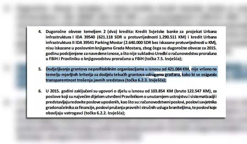 Revizori u izvještaju navode da finansijski rezultat za 2015. godinu nije tačno iskazan za najmanje 1.622.292 KM. Dugoročne obveze temeljem dva kredita: Kredit Svjetske banke za projekat Urbana infrastruktura 1 (1.290.511 KM) i kredit Urbana infrastruktura 2 Parking Mostar veći od pet miliona KM nisu iskazane u poslovnim knjigama Grada Mostara, zbog čega su dugoročne obveze za 2015. godinu potcijenjene za navedene iznose.