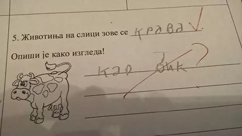 Učeteljica je od osnovca tražila da pored fotografije napiše ime životinje sa slike, te da opiše kako životinja izgleda. Učenik je pored fotografije napisao da je životinja sa slike – krava, što je bio tačan odgovor, a u opisu gdje je tebalo napisati kako krava izgleda, dječak je napisao – kao bik, što je učiteljica ocijenila kao pogrešan odgovor.