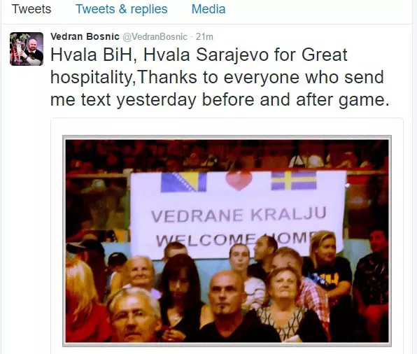 Vedran Bosnić, 40-godišnji Sarajlija selektor košarkaške reprezentacije Švedske sinoć je u dvorani "Mirza Delibašić" sa svojom ekipom doživio poraz od Zmajeva u dramatičnoj i napetoj završnici, a konačni rezultat bio je 74:71, piše bh. novinska agencija Patria.