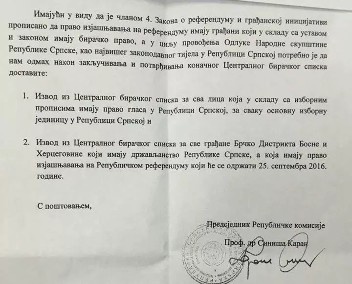 -Imajući u vidu da je članom 4. Zakona o referendumu i građanskoj inicijativi propisano da pravo izjašnjavanja na referendumu imaju građani koji u skladu sa Ustavom i Zakonom imaju biračko pravo, a u cilju provođenja Odluke NSRS kao najvišeg zakonodavnog tijela u RS, potrebno je da nam se odmah nakon zaključivanja i potvrđivanja Centralnog biračkog spiska dostavi: