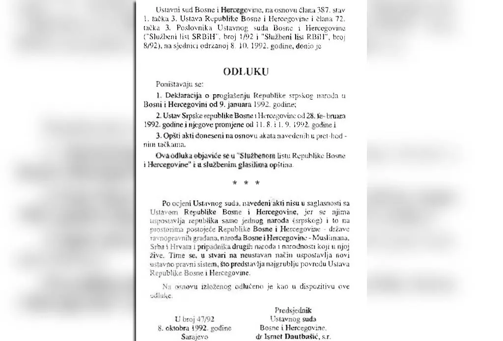 Ustavni sud BiH čiji je predsjednik tada bio Ismet Dautbašić, na sjednici odžanoj 8. oktobra 1992. godine donio je Odluku kojom se ukida Deklaracija o proglašenju „Republike Srpskog naroda u BiH“ od 9. januara 1992. godine, Ustava „srpske republike BiH“ od 28. februara 1992. godine i njegove promjene od 11. avgusta i 1. septembra 1992. godine, piše novinska agencija Patria.