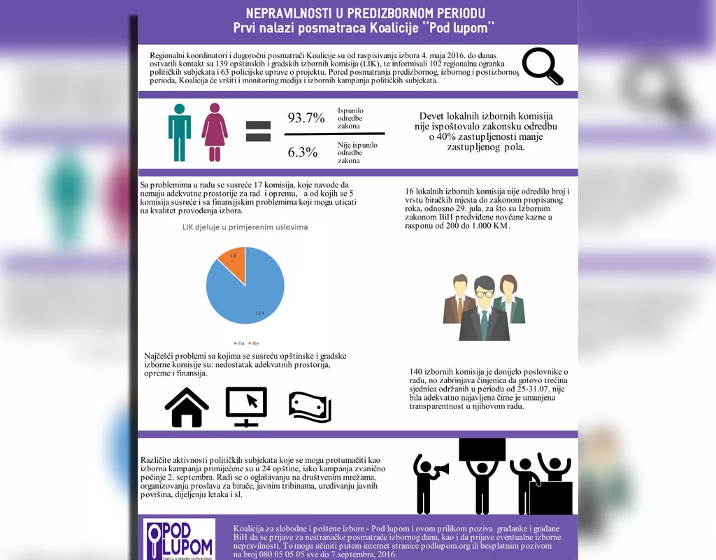 Prema informacijama 42 posmatrača Koalicije „Pod lupom“ 16 gradskih i opštinskih izbornih komisija nije odredilo broj i vrstu biračkih mjesta do zakonom propisanog roka, odnosno 29. jula, za što su Izbornim zakonom BiH predviđene novčane kazne u rasponu od 200 do 1.000 KM.