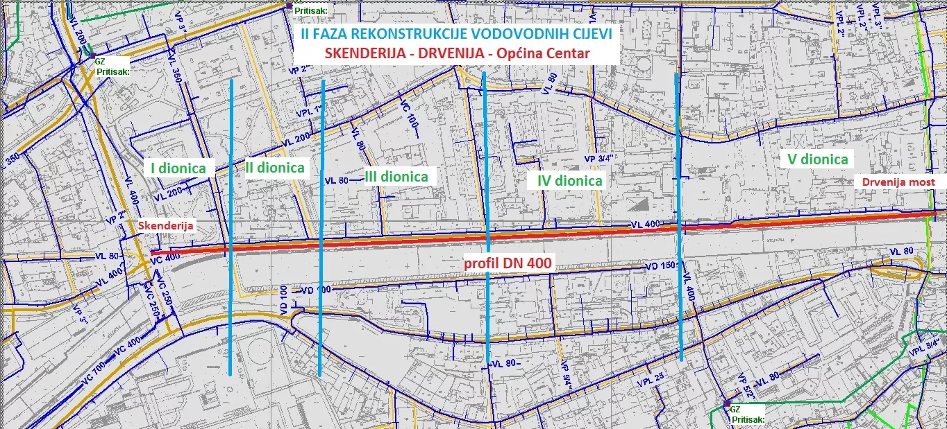 Druga dionica I faze rekonstrukcije, obuhvata zamjenu cca 200 metara cjevovoda profila DN 300 (naznačeno na skici debljom crvenom bojom). Rok za izvođenje radova ove dionice je 10 dana, ako ne bude nekih većih problema.