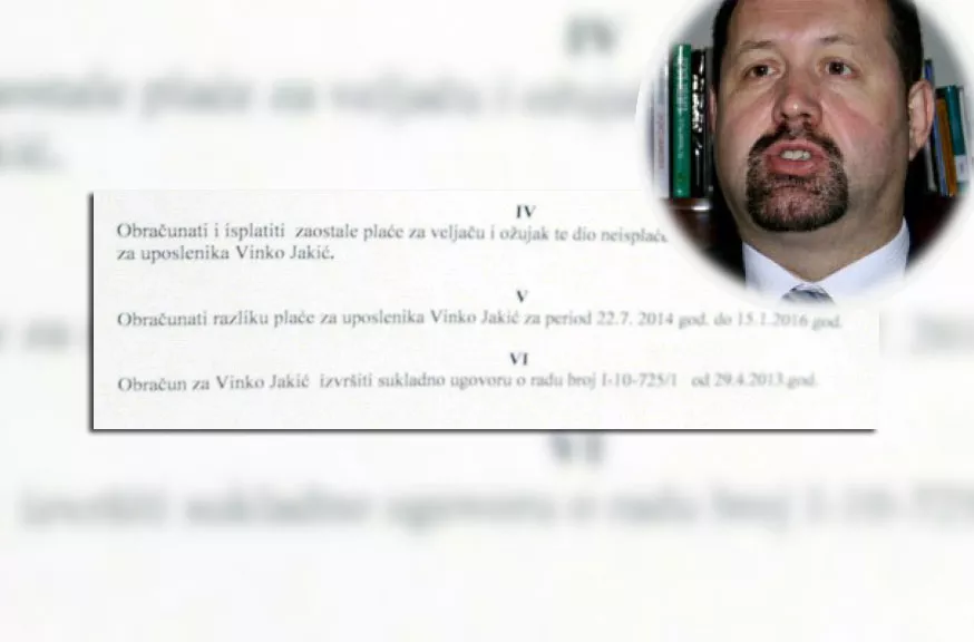 Sačinjena je Odluka, u kojoj se traži da se obračuna razlika plaća za uposlenika Vinka Jakića, za period od 22. jula 2014. do 15. januara 2016. godine, otkriva Patria. Jakić ovu odluku još nije potpisao. Ne navodi se o kojoj količini novca se radi.