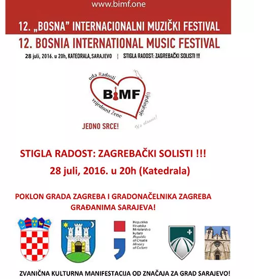 Koncertom Zagrebačkih solista u sarajevskoj Katedrali, bit će okončan koncertni program u okviru 12. Internacionalnog muzičkog festivala Bosna, poznatijeg kao BIMF. Koncert će biti održan u četvrtak, 28. jula, 2016. godine, sa početkom u 20 sati. Ovaj kulturni događaj će biti realizovan pod pokroviteljstvom Grada Zagreba i gradonačelnika Grada Zagreba, Milana Bandića, te podršku Ministarstva kulture Republike Hrvatske, uz partnerstvo s Općinom Stari Grad Sarajevo i Katedralom Srca Isusova, a glavni partner i suorganizator je Veleposlanstvo Republike Hrvatske u BiH, bez čije pomoći koncert ne bi bio moguć, prenosi bh. novinska agencija Patria.