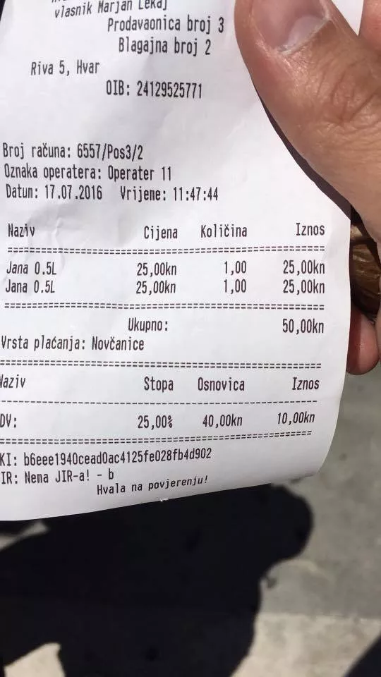 Poznato je da su cijene u restoranima paprene za džep prosječnog građanina BiH, no da ni trgovine nisu više pristupačne dokaz je i račun koji nam je dostavio naš čitatelj. Kaže da je ostao u šoku plativši litar vode Jane 50 kuna odnosno 13 KM! Poređenja radi, u Bosni i Hercegovini litar flaširane vode za piće može se kupiti za jednu KM.