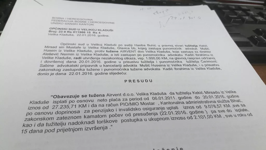 Nakon što je dobio otkaz s posla, Kekić je tužio kompaniju Airvent. Traži povrat na posao. I isplatu plaća za period koji nije radio. Sud u Velikoj Kladuši presudio je početkom godine u korist Kekića. Kompanija Airvent dužna mu je isplatiti nešto više od 27.000 KM na ime plaća, više od 9.000 KM na ime PIO-a, te 2.100 KM na ime sudskih troškova.