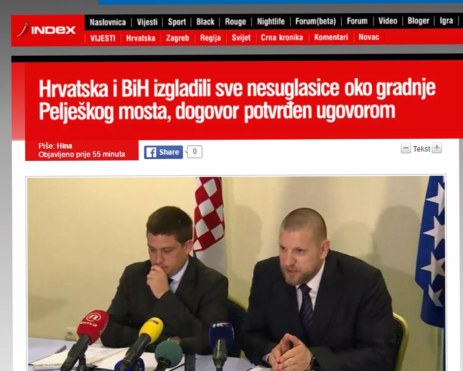 Hrvatski mediji danas u objavili da ne postoje nikakve prepreke za gradnju Pelješkog mosta kojeg je Butković nazvao najvećim strateškim interesom Hrvatske. Ipak, Jusko pojašnjava da je danas samo dobio infromaciju da je osam ljudi iz BiH od 2006. godine uključeno u proces izrade projekta i da su se usaglasili s nekim odredbama gradnje, te da te dokumente donosi u Paralamentarnu skupštinu BiH. No, daleko od toga da je stvar gotova i konačna.
