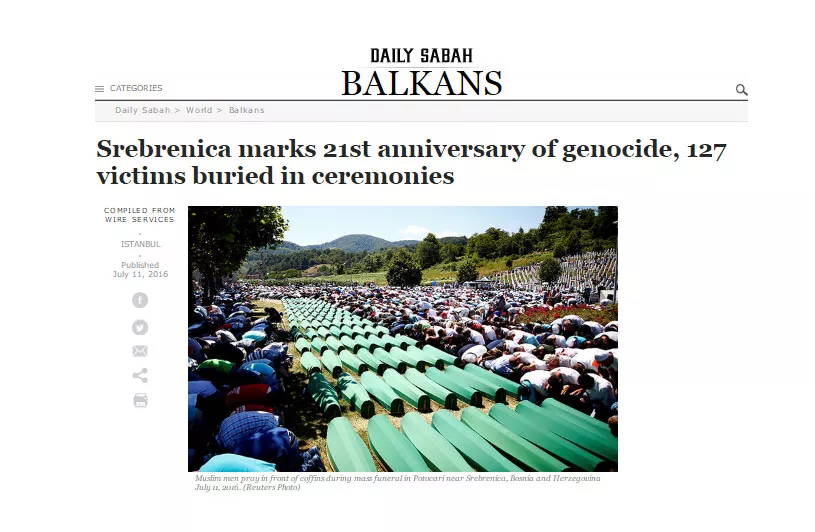 Na dan, 11. jula 2016. godine, kao sjećanje na dan masovnih stradanja srebreničkih Bošnjaka svi elektronski i pisani mediji u Turskoj su prenijeli, kao udarnu vijest obilježavanje 21. godišnjice genocida u Srebrenici. Državna televizija (TRT7) je direktno prenosila dženazu/ukop 127 pronađenih i dentifikovanih, ali nekompletnih ostatakasrebreničkih žrtava genocida.