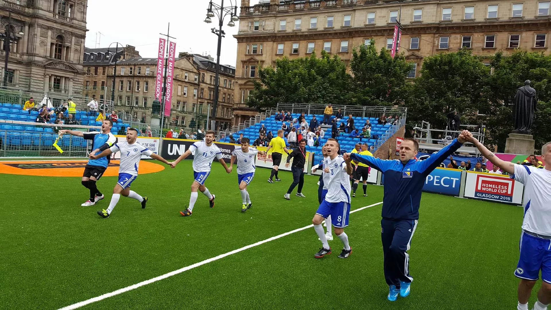 Bh. reprezentacija nogometaša beskućnika sa ostavrene dvije pobjede jučer i prvim mjestom u grupi A plasirala se u drugu grupnu fazu takmičenja na 14. po redu SP-u nogometaša beskućnika u Glasgowu. Naši momci juče su pobijedili Grenadu 6:2, i Egipat 5:4, a utakmica protiv Egipta je bila direktni okršaj za prvo mjesto u grupi, jer je Egipćanima bio dovoljan jedan bod.