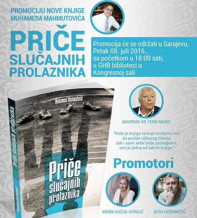 Osmog jula ove godine, sa početkom 18 sati, u Gazi-Husrevbegovoj biblioteci održat će se promocija knjige "Priče slučajnih prolaznika", književnika Muhameda Mahmutovića. Promotori će biti poznata imena, spisateljica i književna kritičarka Indira Kučuk Sorguč, pisac i publicista Avdo Huseinović, te novinar Goran Milić.