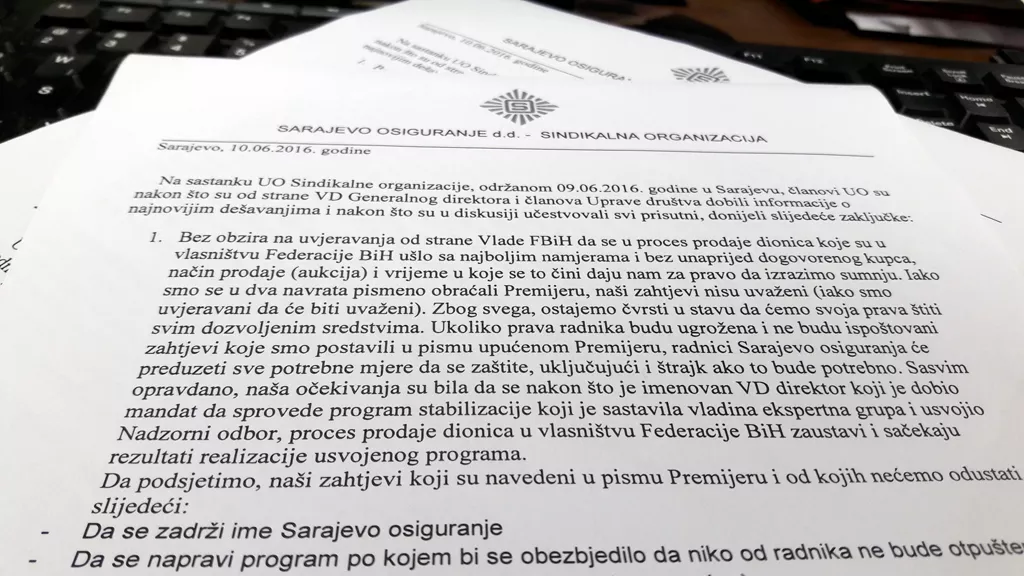 Sindikat Sarajevo-Osiguranja usvojio je nekoliko vrlo oštrih zaključaka na sjednici održanoj polovinom juna, u kojima traži obustavu prodaje dionica ove osiguravajuće kuće.