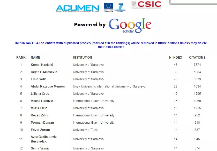 Španska Cybermetrics Lab, istraživačka grupa koja pripada Consejo Superior de Investigaciones Cientificas (CSIC), najvećem javnom istraživačkom tijelu Španije, obavila je rangiranje naučnika iz bosanskohercegovačkih institucija prema podacima s njihovih javnih profila sadržanim u Google Scholaru.