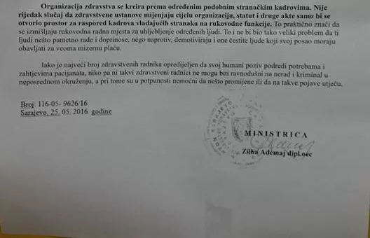 Također, ona je rekla da joj je simptomatično što se sadržina tog „dokumenta“ gotovo poklapa sa sadržajem dopisa koji je njoj kao ministrici upućen iz Ljekarske komore KS, nakon čega je ona baš taj dan sazvala sastanak sa direktorima svih zdravstvenih insitucija u Kantonu Sarajevo, a zbog rješavanja određenih problema.