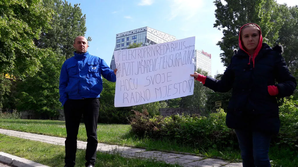 - Bajazit Jašarević – Mensura Zuka – hoću svoje radno mjesto – napisao je Tukar na transparentu kojeg sa suprugom drži na ulazu u zgradu Elektoprivrede.