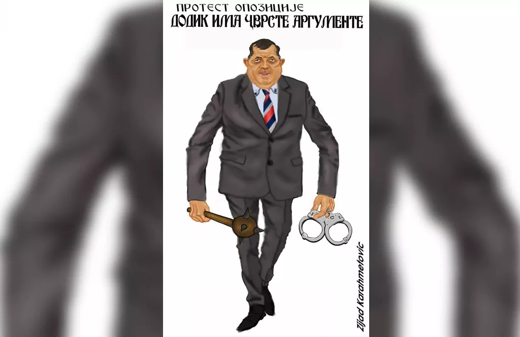Karikaturista Zijad Karahmetović našalio se na račun demokratije Milorada Dodika. Transparentnost aktuelene vlasti u Republici Srpskoj Karahmetović je prikazao u karikaturi, na kojoj Dodik u jednoj ruci drži policijske lisice a u drugoj malj, piše NAP.