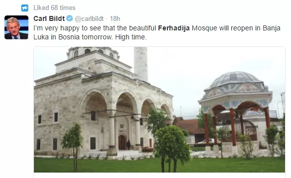 Bivši ministar vanjskih poslova Švedske Karl Bilt napisao je na svom Twitter profilu da je vema sretan što vidi da će prekrasna džamija u Banja Luci ponovo biti otvorena.