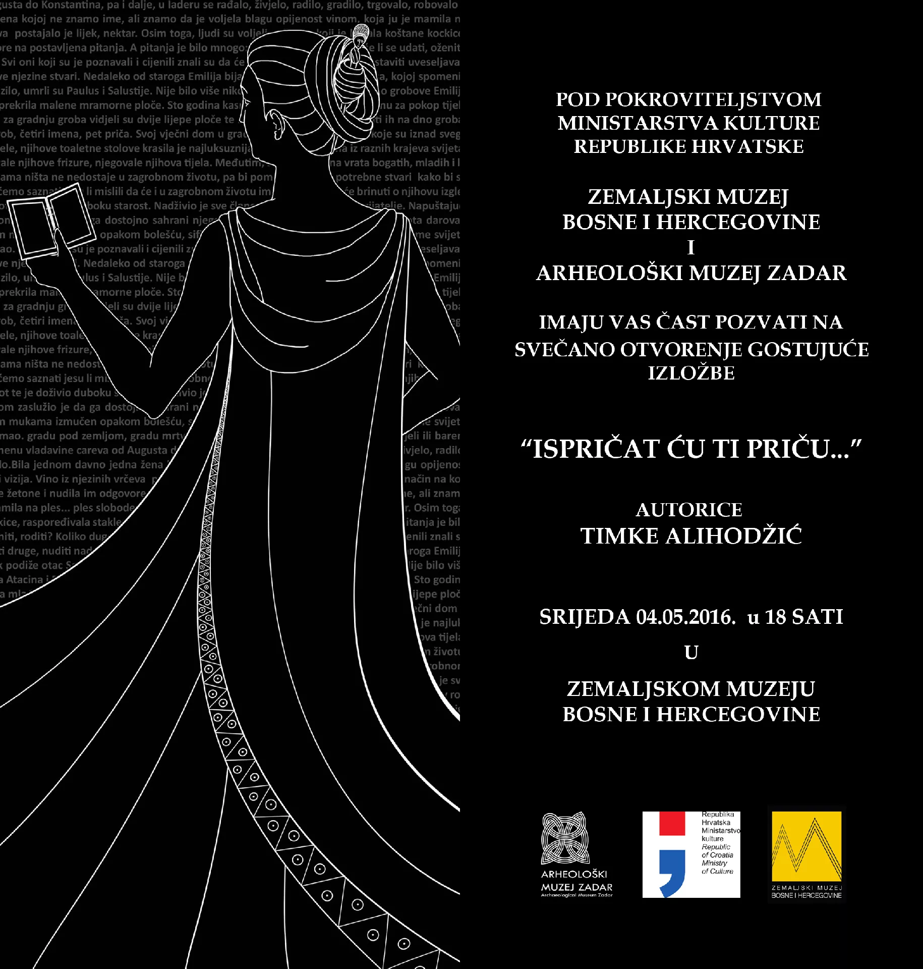 U prostorijama Zemaljskog muzeja Bosne i Hercegovine, pod pokroviteljstvom Ministarstva kulture Republike Hrvatske u srijedu 4. maja u 18 sati bit će otvorena gostujuća izložba „Ispričat ću ti priču“, autorice Timke Alihodžić, kustosice Antičkog odjela Arheološkog muzeja u Zadru, prenosi novinska agencija Patria.