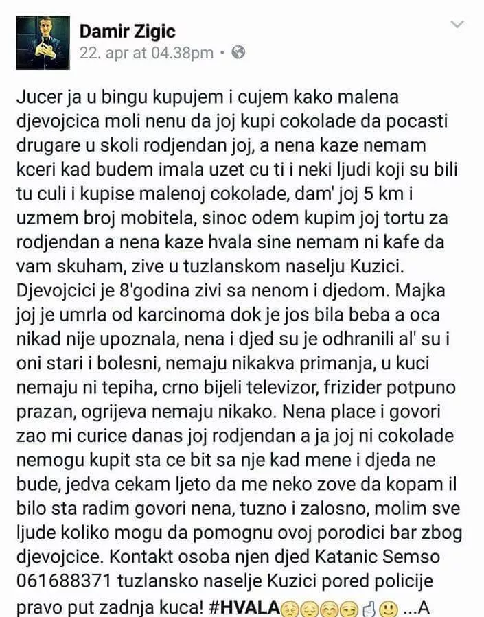 Bombarder iz Mostara, dirnut teškom situacijom porodice djevojčice iz Tuzle, pridružio se akciji putem društvenih mreža i apelirao na pomoć sve ljude dobre volje.