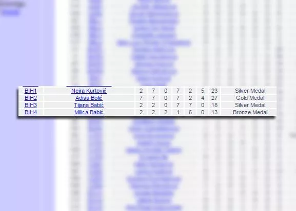 This was the first time for the contestants from BiH to participate at this contest where they showed their worldly knowledge. Adisa Bolic won gold, Neira Kurtovic and Tijana Babic won silver and Milica Babic bronze.