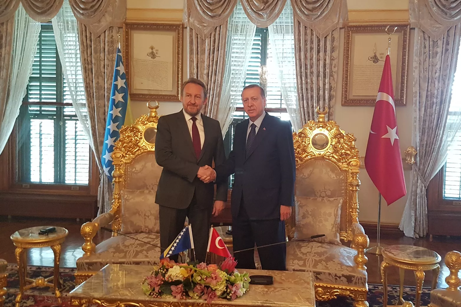 Predsjedavajući Predsjedništva BiH Bakir Izetbegović susreo se s predsjednikom Republike Turske Recepom Tayyipom Erdoğanom, saopćeno je iz Predsjedništva BiH, prenosi novinska agencija Patria.
