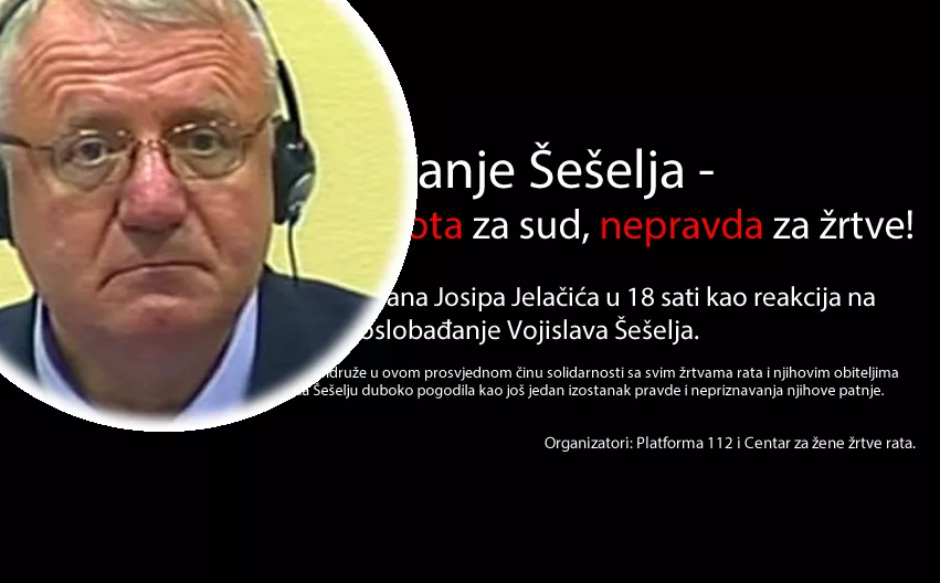 - Platforma 112 i Centar za žene žrtve rata pozivaju građane i građanke da im se pridruže u solidarnosti sa svim žrtvama rata i njihovim porodicima koje je današnja oslobađajuća presuda Šešelju duboko pogodila kao još jedan izostanak pravde i nepriznavanja njihove patnje - stoji u saopćenju Platforme 112.
