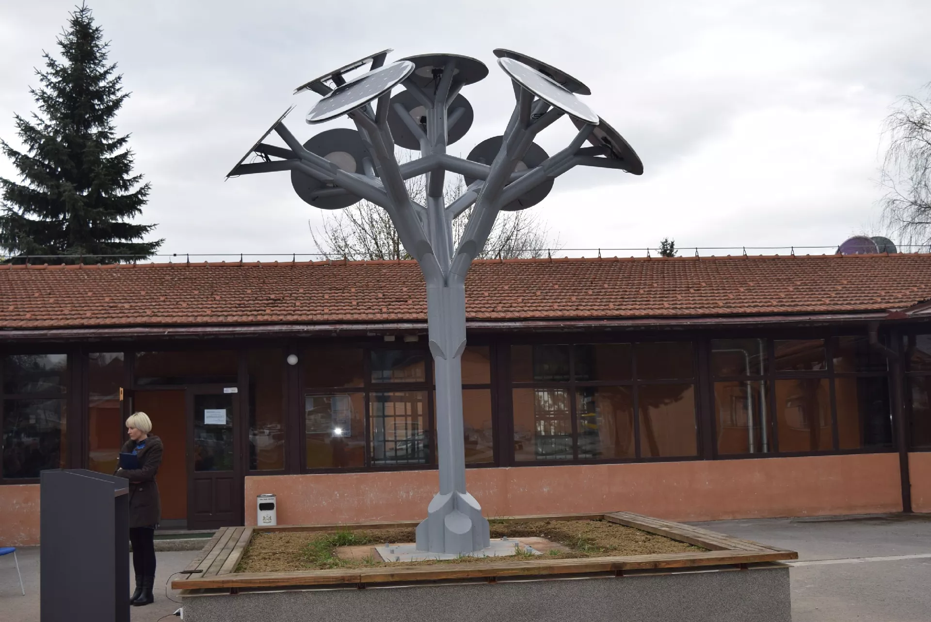 - Riječ je o je metalnoj konstrukciji koja izgledom podsjeća na drvo, visine 4,5 metara, na čijem se vrhu nalazi 10 solarnih ploča. Snaga svake ploče iznosi po 80 W, dakle ukupna instalisana snaga ovog autonomnog foto-naponskog sistema je 800 W - pojasnio je Almedin Kavaz predsjednik Udruženja i voditelj projekta. Po njegovim riječima, ovo nije prvi projekt ovog tipa u svijetu i BiH, ali je ovo „Solarno drvo“ po svom dizajnu jedinstveno, izgleda „futuristički“ a studenti su vodili računa i da bude simetrično.