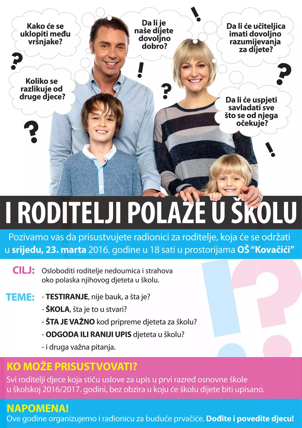 Cilj radionice "I roditelji polaze u školu" je osloboditi roditelje nedoumica i strahova oko polaska njihovog djeteta u školu. Teme su: Testiranje nije BAUK, a šta je? Škola-šta je to ustvari? Šta je važno kod pripreme djeteta za polazak u školu? Odgoda ili raniji upis u školu? I druga važna pitanja.