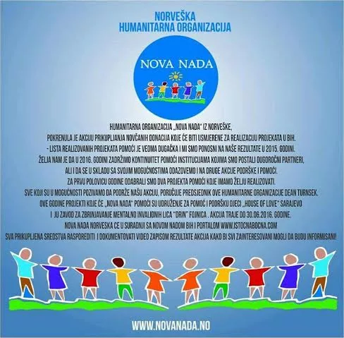 Akciju prikupljanja novčanih donacija koje će biti usmjerene za realizaciju projekata u BiH, a koju je pokrenula Humanitarna organizacija „Nova nada“ iz Norveške trajat će do 30.06.2016. godine, piše novinska agencija Patria.