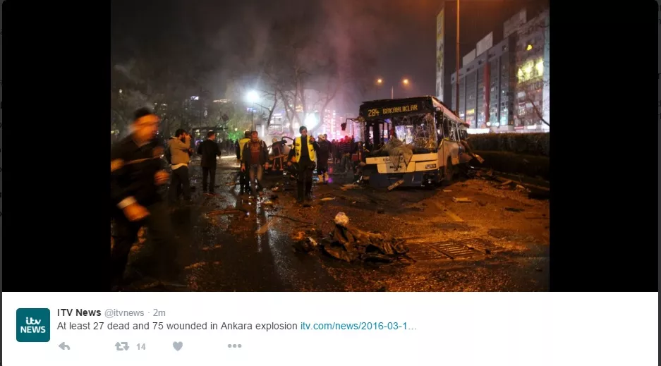 Najmanje 27 osoba je poginulo a 75 teško povrijeđeno u snažnoj eksploziji koja se dogodila u centru Ankare na trgu Kizilay. Dopisnik agencije Patria javlja da se radi o najfrekventnijem trgu u Ankari. Ekspolozija je aktivirana oko 18:45.