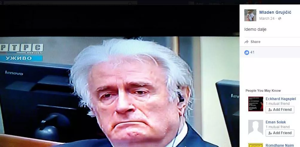 Na dan izricanja presude ratnom zločincu Radovanu Karadžiću, on je slikao TV prijenos i objavio sliku na svom Facebook profilu uz kratku opasku „Idemo dalje“.