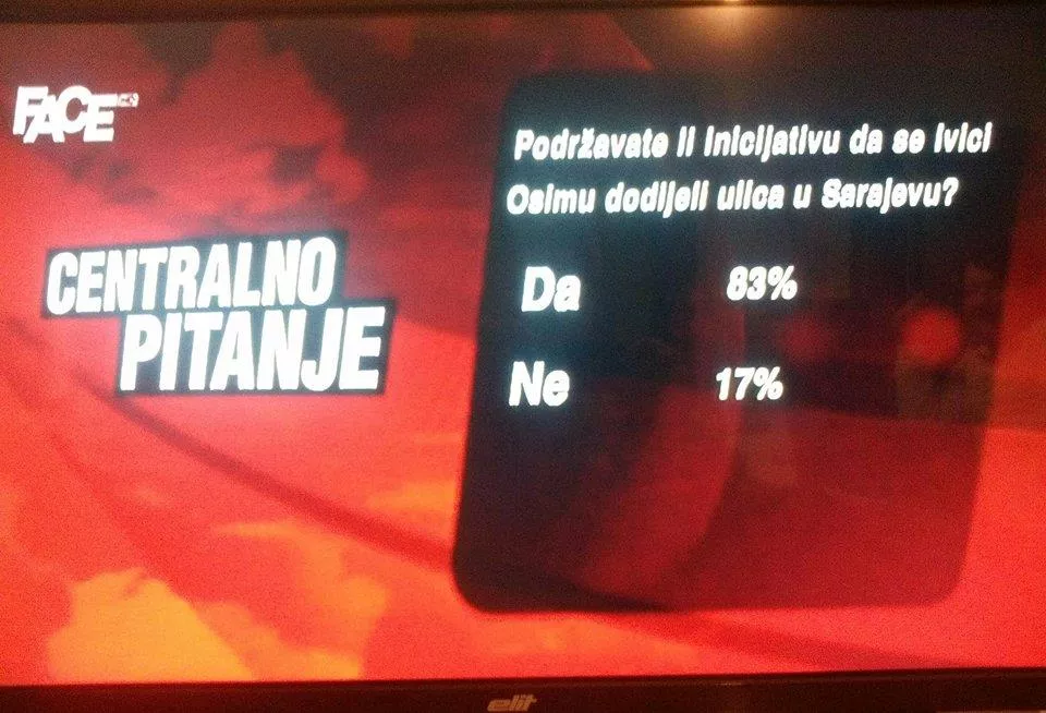 Nakon što je novinar Muhamed Bikić pokrenuo inicijativu da se Ivici Osimu za života dodijeli ulica, tačnije da se sadašnja Zvornička preimenuje u ime legendarnog Štrausa sa Grbavice, protekle sedmice je u Centralnom dnevniku sa Senadom Hadžifejzovićem na Face TV objavljeno Centralno pitanje: Podržavate li inicijativu da se Ivici Osimu dodijeli ulica u Sarajevu?, piše novinska agencija Patria.
