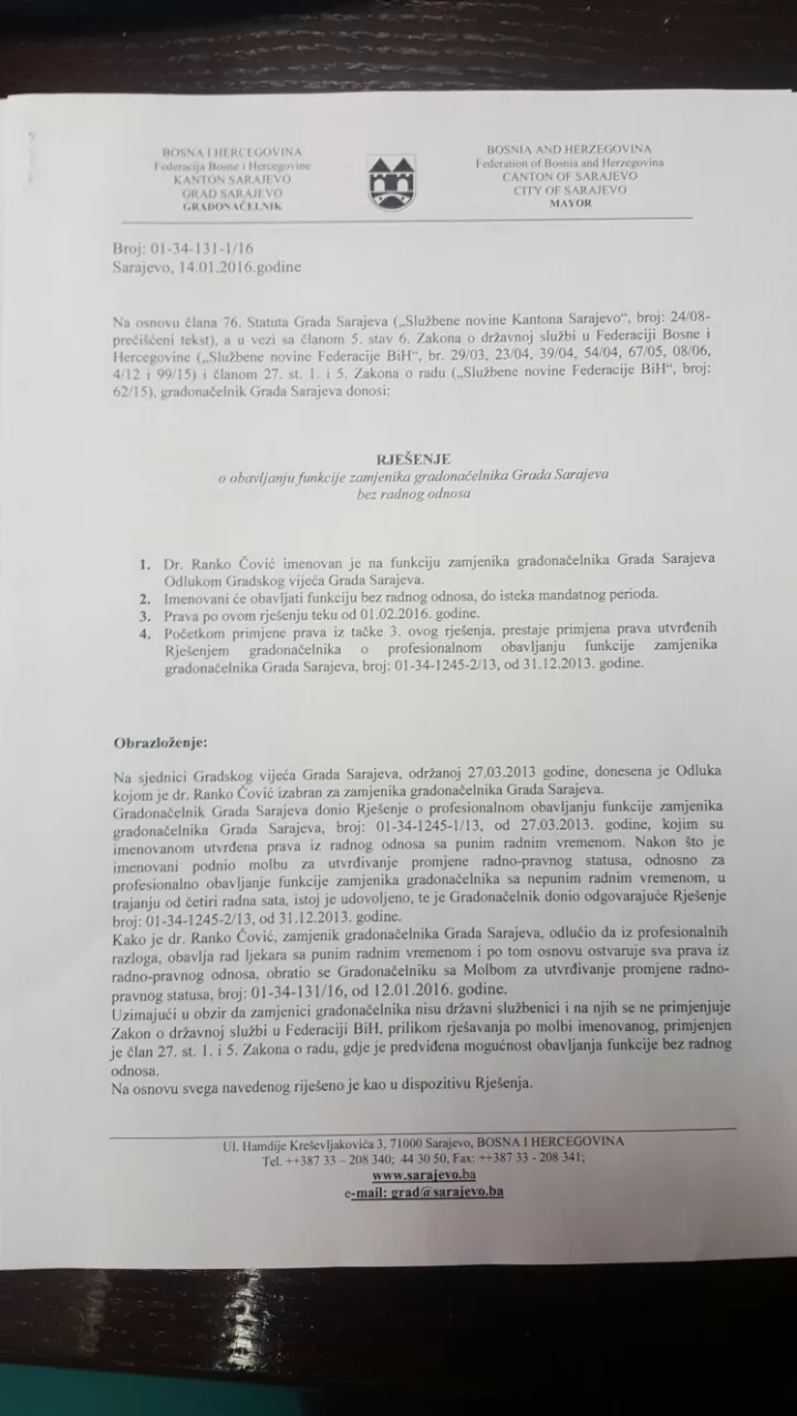 -Povodom Vašeg teksta objavljenog 23.02.2016. a radi korektnog informisanja javnosti dostavljam vam pravosnažno riješenje Gradonačelnika o mom radnopravnom odnosu u Gradu Sarajevu.