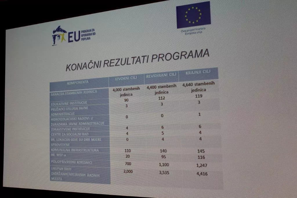 Program je svoje prvobitne ciljeve premašio za 20 procenata u svim sferama u cijeloj zemlji kroz obnovu domova za više od 16.240 lica, obnovu i opremanje 156 škola, 12 obdaništa, šest zdravstvenih ustanova, četiri centra za socijalni rad, tri općinske zgrade, 114 puteva i mostova, kao i 31 objekta za vodosnadbijevanje i kanalizaciju. Pored toga, Program je dodijelio grantove za 116 malih i srednjih preduzeća i 1.270 poljoprivrednih proizvođača, čime je sačuvao i otvorio više od 5.600 radnih mjesta, te je proveo pet mjera za smanjenje rizika od katastrofa kojima su četiri škole i jedna administrativna zgrada zaštićene od potencijalnih poplava i klizišta.