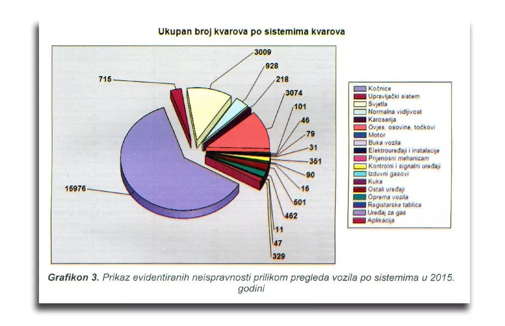 Tako, od 25.984 evidentiranih neispravnih vozila na tehničkim pregledima u 2015. godini kod njih čak 15.967 bile su neispravne kočnice. Dalje slijede krarovi na točkovima, osovinama i ovjesu sa 3.074 kvara, a nakon toga kvarovi na svjetlima koji su registrovani kod 3.009 vozila, piše Patria.